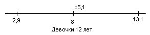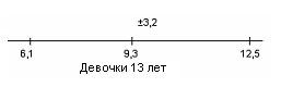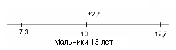 Рис.8 Показатели варьируются от 8,8 до 17,8. У испытуемых девочек в возрасте 13 лет М = 6,1, σ = 3,5(рис.9); у мальчиков 13 лет М = 10,8, σ = 4,6 (рис.10).