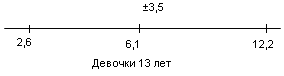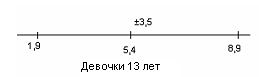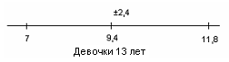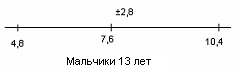 Рис.14 Показатели варьируются от 3,4 до 13,8. У испытуемых девочек в возрасте 13 лет М = 5,4, σ = 3,5(рис.15); у мальчиков 13лет М = 7,6, σ = 2,8(рис.16).