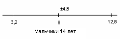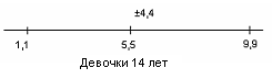 Рис.16 Показатели варьируются от 4,8 до 10,4. У испытуемых девочек в возрасте 14 лет М = 5,5, σ = 4,4(рис.17); у мальчиков 14 лет М = 8, σ = 4,8(рис.18).