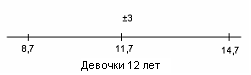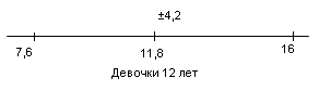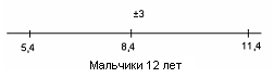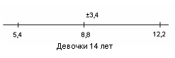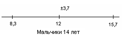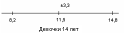 Рис.22 Показатели варьируются от 8,4 до 12. У испытуемых девочек в возрасте 14 лет М = 11,5, σ = 3,3(рис.23); у мальчиков 14 лет М = 12, σ = 3,7(рис.24).