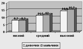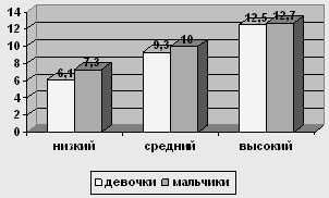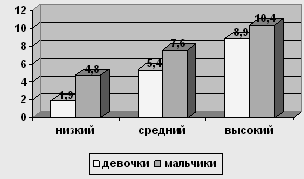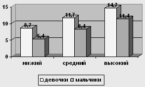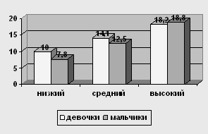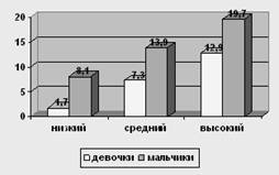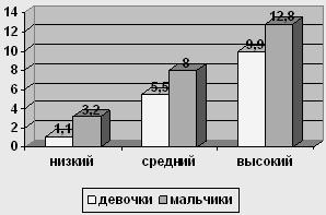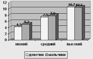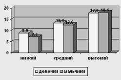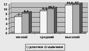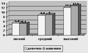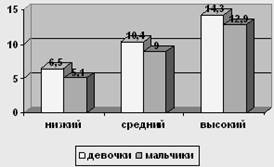 Рис. 4 Сравнение уровней по шкале "Директивность" у мальчиков и девочек 12-ти лет У испытуемых девочек в возрасте 12 лет низкий уровень о 0 до 7,6, средний – от 7,6 до 11,8, высокий – от 11,8 до 16. У мальчиков в возрасте 12 лет низкий уровень от 0 до 8,8, средний уровень от 8,8 до 13,3, высокий – от 13,3 до 17,8.