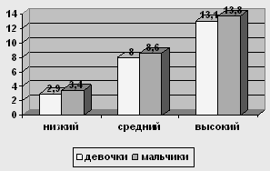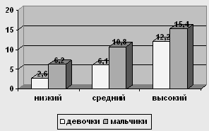 Рис. 5 Сравнение уровней по шкале "Директивность" у мальчиков и девочек 13-ти лет У испытуемых девочек в возрасте 13 лет низкий уровень о 0 до 2,6, средний – от 2,6 до 6,1, высокий – от 6,1 до 12,2. У мальчиков в возрасте 13 лет низкий уровень от 0 до 6,2, средний уровень от 6,2 до 10,8, высокий – от 10,8 до 15,4.