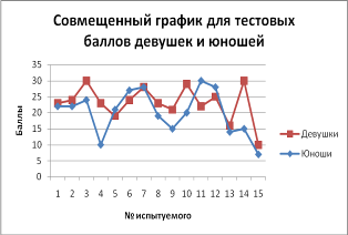 Рис. 1. Совмещенный график для тестовых баллов девушек и юношей Таблица 1. Частота полученных тестовых баллов