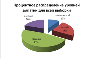 Рис.4. Процентное распределение уровней эмпатии для подвыборки девушек Таблица 4. Частота встречаемости тестовых баллов для всей выборки. (сгруппированные данные)