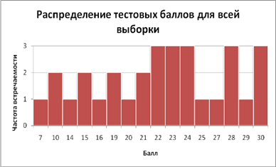 Рис. 2. Распределение тестовых баллов для всей выборки Из визуального анализа данной гистограммы видно, что для данной выборки по частоте преобладают значения баллов 30 (высокий уровень эмпатийных тенденций), 28, 24, 23, 22 (средний уровень эмпатийных тенденций)[1]. В целом большая часть баллов сосредоточена вокруг средних значений, что говорит о близости распределения к нормальному. Таблица 2. Частота встречаемости тестовых баллов для подвыборки юношей. (сгруппированные данные) [2]