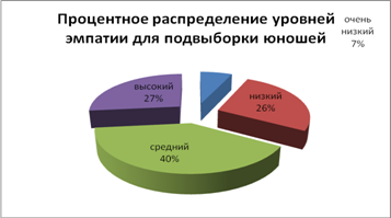 Рис.5. Процентное распределение уровней эмпатии для всей выборки В целом из визуального анализа можно заключить, что результаты не показывают значительных различий. Чтобы более точно проверить распределения результатов для обеих подвыборок на наличие существенных различий в уровне эмпатии, воспользуемся критерием U – Манна-Уитни. Н0: Уровень эмпатии в подвыборке юношей не ниже уровня эмпатии в подвыборке девушек. Н1: Уровень эмпатии в подвыборке юношей ниже уровня эмпатии в подвыборке девушек. Основные расчеты представлены ниже: Таблица 5. Индивидуальные значения уровня эмпатии для подвыборок юношей и девушек