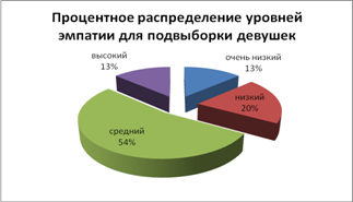 Рис.3. Процентное распределение уровней эмпатии для подвыборки юношей Таблица 3. Частота встречаемости тестовых баллов для подвыборки девушек. (сгруппированные данные)