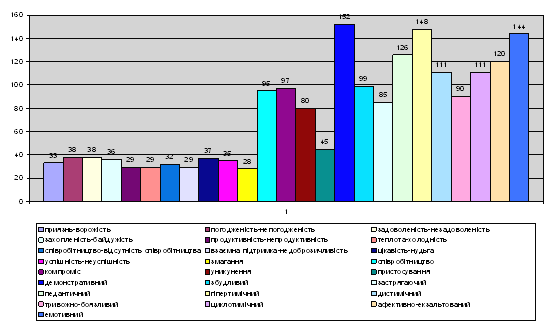 Рис.1. Загальна діаграма дослідження міжособових взаємин в педколективі. Переважання у атмосфері колективу таких позитивних ознак, як погодженості, задоволеності, цікавості, захопленості та приязні свідчить про те, що колектив взаємодіє у напрямку досягнення оптимального психологічного клімату та доброзичливих міжособових взаємин у колективі. Продуктивність, спільна підтримка та теплота переважають у меншій кількості - це свідчить про те, що рівень бажаної, позитивної атмосфери ще недостатньо сформований. Це може бути пов`язано із переважанням індивідуально-суб`єктивного трактування членами даного педколективу загальних понять, щодо розуміння цінностей, норм та традицій, які переважають у колективі і лежать в основі становлення безконфліктних міжособових стосунках, а також із переважаючими типами акцентуацій особистості (демонстратвного, гіпертимічного та емотивного) та найбільш частішого вибору стратегії поведінки у конфліктних ситуаціях - компромісу, співробітництва, уникнення. Також було проведено статистичний кореляційний аналіз загальної кількості шкал з метою перевірки наскільки міжособові стосунки залежать від соціопсихологічного клімату, вибору оптимальної стратегії поведінки у конфліктних ситуаціях, переважаючого типу особистісної акцентуації та безконфліктного спілкування. (Див. дод. Г) З результатів статистичного аналізу видно, що прокорелювали такі шкали як: Вік - стать: позитивно-безконфліктні, емоційно-стійкі міжособові стосунки прямопропорційно залежать від гендерно-вікових еквівалентів колективу як групи; Стать - демонстративний, збудливий, афективно-екзальтований типи акцентуацій: підвищена здатність до витіснення та демонстративності поведінки, імпульсивності, послабленням контролю над потягами й стимулами, які легко спалахують та активізуються у захопленні від радісних подій і зникають від невтішних, залежить від статі членів педагогічного колективу; Вік - збудливий, дистимічний типи акцентуацій: понижений фон настрою песимізм, фіксація на невеселих подіях професійної діяльності, ідеомоторна загальмованість, підвищена імпульсивність починає проявлятись із збільшенням особово-вікового періоду педколективу і призводити до виникнення конфліктних ситуацій, і як наслідку - погіршенню стосунків; Приязнь-ворожість - співробітництво, уникнення: в залежності від переважання приязного, чи ворожого ставлення членів колективу одне до одного обираються оптимальні стратегії поведінки задля підтримання позитивного психологічного клімату; Погодженість-непогодженість - задоволеність-незадоволеність: вирішення спільних рішень колективу, яке проявляється ознаками задоволення, або незадоволення координується узгодженістю; Захопленість-байдужість - дистимічний тип акцентуації: для деяких осіб даного колективу є характерним фіксація на негативних ситуаціях, які виникали внаслідок розбіжності поглядів,щодо певних питань; Теплота-холодність - компроміс: якщо у колективі приймається компромісне укладення угоди завдяки обопільному й вимушеному усвідомленню не лише своїх інтересів, а й інтересів іншого, то переважно воно проявляється у вигляді теплого чи холодного ставлення до тих членів колективу, через яких і було прийнято цю компромісну угоду; Взаємна підтримка-недоброзичливіс