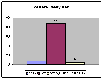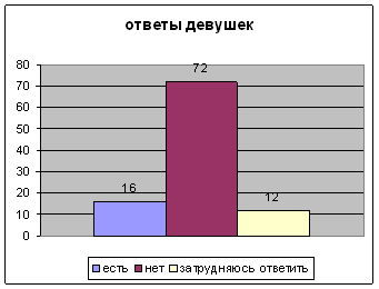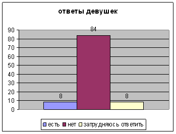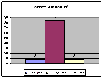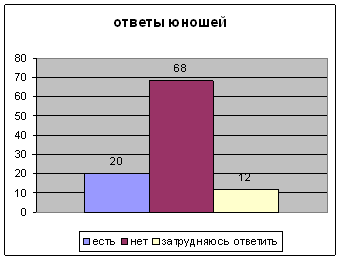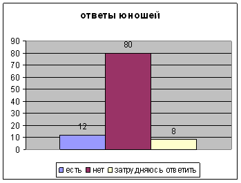 Рисунок 9. Наличие у респондентов среди близких друзей представителей чеченской этнической группы. У подавляющего большинства и девушек, и юношей (около 80%) нет среди близких друзей представителей азербайджанской, армянской и чеченской этнической группы. В равной степени респонденты выбирали варианты «да» или «затрудняюсь ответить». Причиной отсутствия у респондентов близких друзей из представителей данных этнических групп может быть объяснено неосознанной боязнью открыться перед человеком другой национальности, довериться ему (рис. 7, 8, 9).