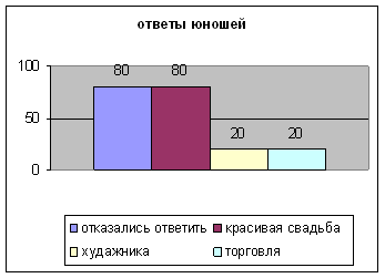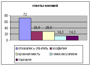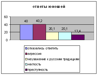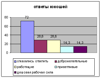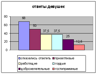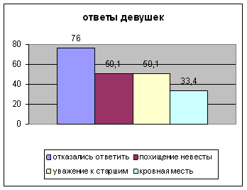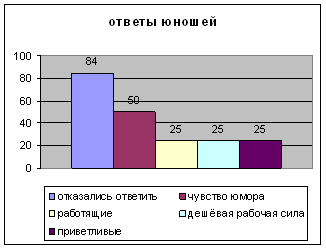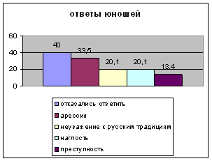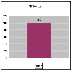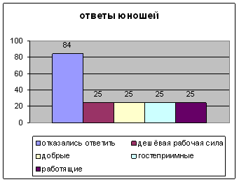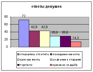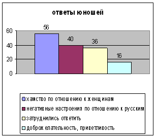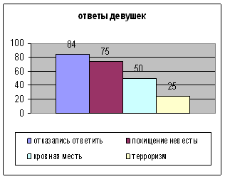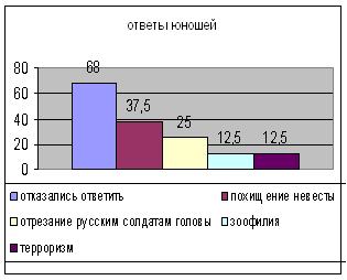Рисунок 25. Традиции, присущие по мнению респондентов, чеченской культуре. Предложение респондентам написать, какие они знают традиции, присущие каждой из рассматриваемых нами культур, вызвало большое количество отказов ответить. Около 70% юношей и девушек отказались отвечать в отношении каждой интересующей нас этнической группы. Это может быть связано с поверхностным отношением к заполнению анкеты или с отсутствием знаний о кавказских традициях. Юноши в отношении традиций азербайджанской культуры имеют весьма негативную точку зрения. Азербайджанской культуре в традиции приписываются кровная месть, зоофилия (по 28,6%), гомосексуализм и торговля (по 14,3%). Девушки отметили такие традиции: похищение невесты, кровная месть (42,9%), торговля, уважение к старшим (28,6%) и красивая свадьба (14,3%). В представлении молодых людей, армянской культуре соответствуют следующие традиции: красивая свадьба (80%), торговля и «художники», что следует понимать как наличие большого числа художников среди представителей армянской этнической группы (по 20%). Как традиции армянской культуры девушки отметили похищение невесты, уважение к старшим (по 50,1%) и кровную месть (33,4%). Негативную оценку у молодых людей получили традиции чеченской культуры. Похищение невесты отметили 37,5% респондентов мужского пола, 25% написали «отрезание русским солдатам головы», зоофилию и терроризм отметили 12,5% юношей. Оценка девушек также негативна – 75% отметили похищение невесты, 50% кровную месть. Терроризм как традицию написали 25% девушек. Столь негативные оценки можно объяснить отсутствием у респондентов знаний о кавказских культурах, влиянием СМИ на формировании в сознании людей образа «кавказских преступных группировок». Также на результаты исследования могли повлиять недавние теракты в московском метро (рис. 23, 24, 25). Проанализировав ответы на вопросы, представляющие когнитивный блок, можно сделать вывод, что для студентов города Новокузнецка национальность не является решающим фактором в общении с человеком, однако у подавляющего большинства респондентов как женского, так и мужского пола отсутствуют среди знакомых и близких друзей представителей интересующих нас этнических групп. Представителей различных этнических групп респонденты описывают как трудолюбивых и гостеприимных, однако наглых, агрессивных преступников. Представители всех интересующих нас этнических групп, по мнению респондентов, проявляют хамство по отношению к женской части русского населения. И азербайджанцы, и армяне, и чеченцы у респондентов ассоциируются с преступностью и торговлей. Можно утверждать, что респонденты мало знакомы с традициями культур Кавказа и приписывают к ним кровную месть, похищение невесты. Чеченской культуре, по мнению респондентов, также соответствует зоофилия, отрезание русским солдатам головы и терроризм. Ответы на вопросы из эмоционального блока (вопросы, ответы на которые дают возможность выявить чувства респондентов по отношению к представителям той или иной этнической группы) дали нам следующие результаты. Таблица 1. Отношение респондентов к представителям различных этнических групп, обучающихся с респондентами в одном ВУЗе.
