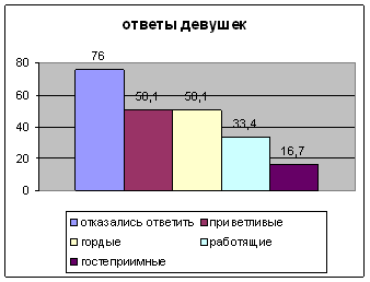 Рисунок 13. Положительные качества, присущие по мнению респондентов, представителям чеченской этнической группы. На предложение перечислить положительные качества, присущие каждой из этнических групп, было получено очень большое количество отказов это сделать (в среднем около 80% как у девушек, так и у юношей). Возможно, это связано с отсутствием позитивного опыта общения с представителями интересующих нас этнических групп или с агрессией в их адрес. В адрес азербайджанской этнической группы были получены следующие ответы. Юноши азербайджанцев описывают как доброжелательных, работящих (по 28,6%), приветливых и как «дешёвая рабочая сила» (по 14,3%). Половина из ответивших девушек описали азербайджанцев как приветливых. Трудолюбие и гордость им приписывают 37,5% девушек. Также были отмечены доброжелательность и гостеприимство. Армянской этнической группе, на взгляд юношей, соответствуют такие качества, как доброта, гостеприимство, трудолюбие, «дешёвая рабочая сила» (все ответы по 25%). Девушки армян описывают как приветливых, гордых (по 50,1%), трудолюбивых и гостеприимных (по 33,4% и 16,7% соответственно) (рис. 11, 12, 13).