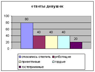 Из табл. 2 видно, что больше всего негатива респонденты (как в целом, так и отдельно юноши и девушки) испытывают к попыткам познакомиться, исходящих от представителей чеченской этнической группы. Наиболее позитивно респонденты относятся к попыткам знакомства, исходящих от армян. Примерно равный процент молодых людей относится нейтрально или крайне враждебно к попыткам познакомиться, исходящих от представителей различных этнических групп. Около 40% девушек к попыткам знакомства относятся крайне враждебно, примерно 30% нейтрально. Это можно объяснить желанием сохранить некоторую дистанцию и тем, что девушки гораздо чаще сталкиваются с такими предложениями (табл. 2).