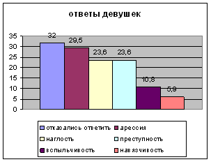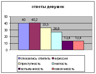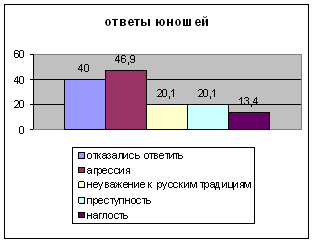 Рисунок 16. Отрицательные качества, присущие по мнению респондентов, представителям чеченской этнической группы. На просьбу перечислить отрицательные качества, характеризующих представителей различных этнических групп, было получено почти вдвое меньше отказов, что можно объяснить негативным опытом общения респондентов с представителями той или иной этнической группы. Молодые люди описывают азербайджанцев следующим образом. Большинство ответов пришлось на такое качество как «агрессия» (33,5%), далее были отмечены наглость и неуважение к традициям принимающей стороны (по 20,1%), также был вариант «преступность» (13,4%). Представительницы женского пола характеризуют азербайджанцев как агрессивных (29,5%). Такие качества как наглость и «преступность» отметили 23,6% ответивших девушек. Также были отмечены вспыльчивость, навязчивость. Ответы респондентов обоих полов о представителях чеченской этнической группы вцелом похожи. На первом месте у юношей и девушек оказалась такая характеристика как агрессия (её отметили 46,9% и 40,2% респондентов соответственно). Преступность, как качество, получила второе место (20,1% юношей и 33,5% девушек). Так же были отмечены неуважение к традициям и наглость. Можно предположить, что «преступность», отмеченную как негативное качество, следует интерпретировать как негативное последствие иммиграции представителей различных этнических групп в город Новокузнецк (рис. 14, 15, 16).