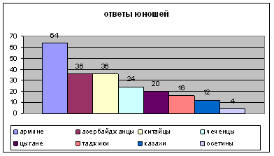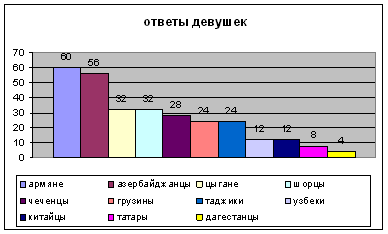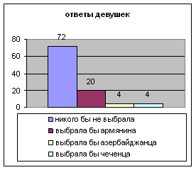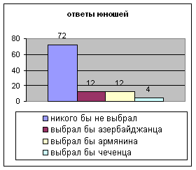 Рисунок 38. Выбор респондентов партнёра по общению. В качестве партнёра по общению 12% юношей и 20% девушек выбрали бы представителя армянского этноса. Никого из представителей азербайджанской, армянской, чеченской этнической групп не выбрало бы 72% респондентов обоих полов (рис.38).