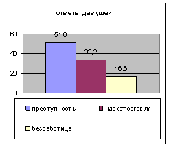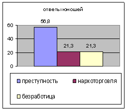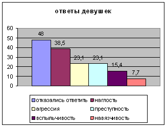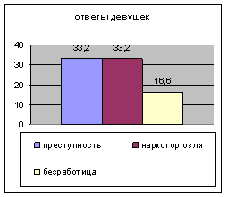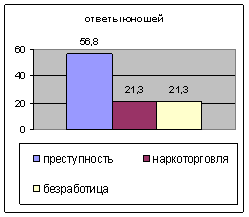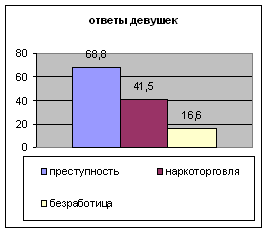 Рисунок 37. Негативные последствия от представителей чеченской этнической группы. Преступность в качестве негативного последствия от иммиграции представителей различных этнических групп в Новокузнецк отметили 56,8% юношей. Девушки отметили преступность как последствие от иммиграции также в адрес всех этносов, но больший процент такого ответа принадлежит чеченской этнической группе – 68,8%. Также иммиграция чеченцев, по мнению девушек, ведет к торговле наркотиками в 43%. Армяне и азербайджанцы у девушек с наркотиками связаны в 33,2%. Юноши с наркотиками связывают иммиграцию всех этносов в 21,3%. И юноши и девушки отметили безработицу как негативное последствие от иммиграции вцелом (21,3% и 16,6% соответственно) (рис. 35, 36, 37). Проанализировав блок вопросов, посвящённый эмоциональному восприятию иммигрантов респондентами, можно сделать следующие выводы. Новокузнецкие студенты нейтрально относятся к представителям разных этносов, обучающимся с ними в ВУЗе, но негативно к попыткам знакомства, исходящих от них же. Респонденты к армянам испытывают более позитивные эмоции, чем к азербайджанцам и чеченцам. Больше всего недоброжелательности наблюдается по отношению к представителям чеченской этнической группы. Респонденты не хотят видеть в Новокузнецке иммигрантов или относятся к этому нейтрально. Около 30% респондентов видят какую-либо пользу от иммиграции. Эта польза проявляется в том, что иммигранты представляют собой дешёвую рабочую силу. Девушки настроены к иммигрантам более дружелюбно, так как в иммиграции видят такой плюс как знакомство с новой культурой. Большинство респондентов считают, что от иммиграции представителей различных этнических групп есть негативные последствия. В качестве таких последствий респонденты отмечали преступность и торговлю наркотиками. Подвергнув анализу ответы на вопросы, представляющие поведенческий блок (блок, дающий нам представление об особенностях поведения респондентов и представителей исследуемых этнических групп по отношению друг к другу), мы пришли к таким результатам.