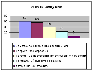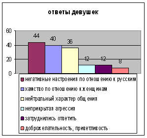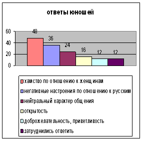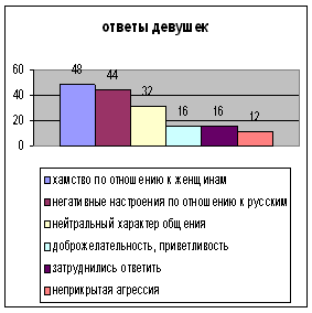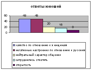 Рисунок 19. Характер общения представителей чеченской этнической группы с русским населением. Большинство юношей (56%) считают, что характер общения азербайджанцев с русскими можно описать как «хамство по отношению к женщинам», 40% парней отмечают «негативные настроения по отношению к русским», затруднились ответить 36%. Девушки отмечают негативные настроения по отношению к русским и хамство по отношению к женщинам (44% и 40% соответственно). 36% девушек отметили нейтральный характер общения. Одинаково распределись ответы в отношении армянской этнической группы. На первом месте и у юношей и у девушек хамство по отношению к женщинам (по 48%). На втором месте негативные настроения по отношению к русским, на третьем – нейтральный характер общения. При оценке характера общения представителей чеченской группы с русским населением были получены следующие результаты. Молодые люди в равной степени отметили хамство к женщинам и негативные настроения (по 48%). Нейтральный характер общения выбрали 20% респондентов мужского пола. Девушки в данном вопросе на первое место поставили хамство по отношению к женщинам (60%), на второе – неприкрытую агрессию (56%). Столь негативное отношение в сознании студентов к представителям чеченской этнической группы можно объяснить возможностью ассоциирования чеченца с образом террориста (рис. 17, 18, 19).