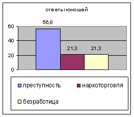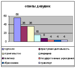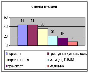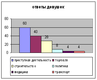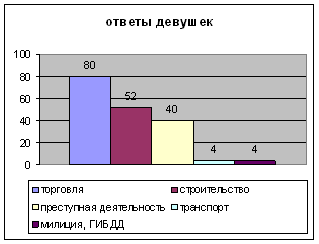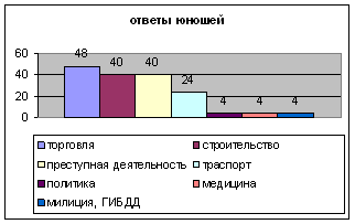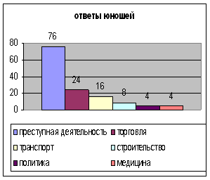 Рисунок 22. Род деятельности, ассоциирующийся с представителями чеченской этнической группы. Азербайджанцы у девушек и юношей ассоциируются с торговлей (80% и 40% соответственно), строительством (52% и 40%), и с преступностью (по 40%). В качестве ассоциируемого рода деятельности с представителями армянской этнической группы, молодые люди поставили на первое место торговлю и преступность (по 44%). На второе строительство (36%), на третье место – милицию и ГИБДД (20%). У девушек с армянами ассоциируется торговля (56%), строительство и преступность (по 36%). Чеченская этническая группа ассоциируется и у юношей, и у девушек в первую очередь с преступностью (76% и 60% соответственно), затем с торговлей (24% и 40% соответственно). Юноши на третье место поставили транспорт, а девушки строительство. Такие результаты могут быть связаны с тем, что действительно, в повседневной жизни можно наблюдать большое количество выходцев с Кавказа, работающих на рынках и стройках. Так же это может быть обусловлено влиянием СМИ, зачастую пропагандирующих образ преступника – кавказца (рис. 20, 21, 22).