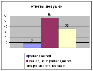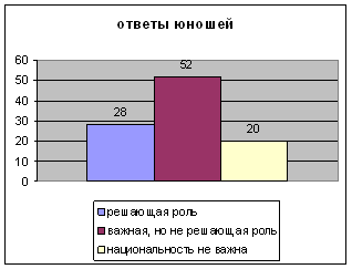 Рисунок 3. Роль национальности в отношениях с человеком. В отношениях с человеком национальность играет важную роль, но не решающую у большинства респондентов (52% юношей и 56% девушек). Далее мнения разделились. «Мне совсем не важна национальность человека» ответили 36% девушек и 20% юношей. Национальность играет главную роль при общении у 28% молодых людей и всего у 8% девушек. Это может служить показателем того, что девушки более толерантны и терпимы, нежели юноши (рис. 3). Данные различия можно объяснить более высоким уровнем терпимости к представителям других культур у девушек.
