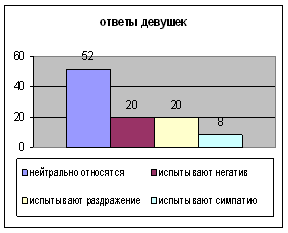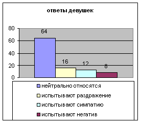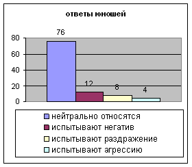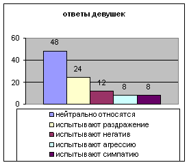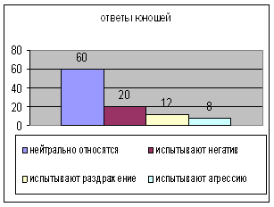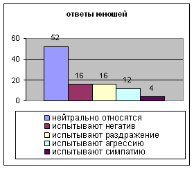 Рисунок 28. Ощущения респондентов по отношению к представителям чеченской этнической группы. Относительно позитивные ощущения респонденты испытывают по отношению к армянам. 76% юношей и 64% девушек относятся к ним нейтрально, 12% девушек испытывают симпатию. Агрессию по отношению к армянам ощущают только 4% молодых людей. К азербайджанцам нейтрально относятся 60% юношей и 52% девушек. 20% как юношей, так и девушек испытывают к ним негатив. 20% девушек азербайджанцы раздражают. Самую негативную оценку получили чеченцы. Нейтрально к ним относятся около 50% респондентов обоих полов. Раздражение к ним испытывают 24% девушек и 16% юношей. Агрессию по отношению к чеченцам чувствуют 12% молодых людей (рис. 26, 27, 28).