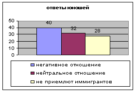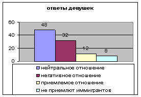 Рисунок 29. Отношение респондентов к иммиграции представителей различных этнических групп в г. Новокузнецк. 40% юношей и 32% девушек не хотели бы видеть иммигрантов из различных этнических групп в городе Новокузнецке. Нейтрально к иммиграции относятся 32% молодых людей и 48% девушек. Ни один респондент не относится к иммиграции положительно (рис. 29).