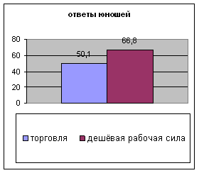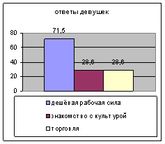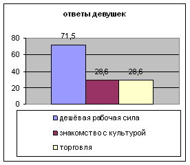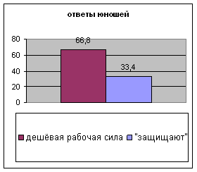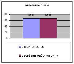 Рисунок 33. Положительные последствия, приносимые представителями чеченской этнической группы. В качестве положительных последствий от иммиграции все респонденты отметили «дешёвая рабочая сила», причем девушки отмечали данный вариант в 71,5% по отношению к азербайджанцам и армянам и в 57,2% к чеченцам. Юноши же данный вариант ответа указали в 16,7% по отношению ко всем. Молодые люди также отмечали то, что азербайджанцы занимаются строительством (66,8%), армяне торгуют (50,1%), чеченцы защищают (33,4%). 28,6% девушек в качестве пользы ото всех этнических групп отметили торговлю и знакомство с культурой. Данные ответы можно объяснить небольшим желанием русского населения работать в той сфере, в которой работают представители рассматриваемых нами этнических групп (торговля, строительство). Очевидно, девушки настроены более терпимо к иммигрантам, чем юноши, так как расценивают знакомство с культурой как положительное последствие иммиграции (рис. 31, 32, 33).