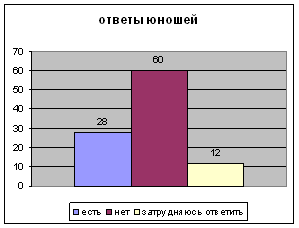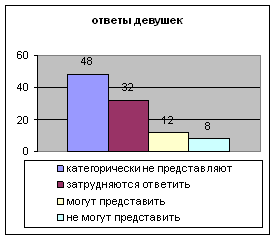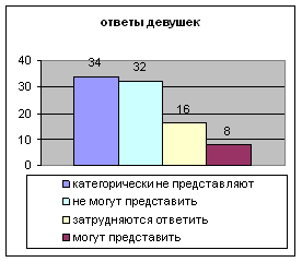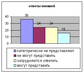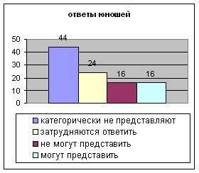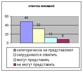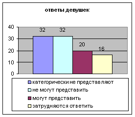 Рисунок 40. Возможность респондента представить свой брак с представителем (представительницей) армянской этнической группы. Ни один из респондентов не может представить себе брак с представителем (представительницей) армянской этнической группы. 48% юношей и 32% девушек категорически не представляют такой брак. Могут представить - 12% молодых людей и 20% девушек. Затруднились ответить 32% и 16% юношей и девушек соответственно (рис. 40).