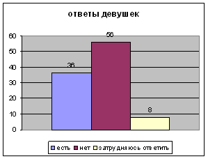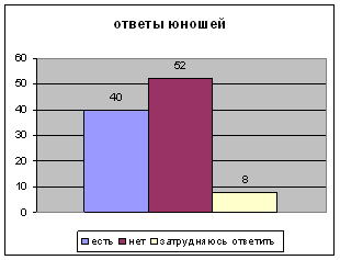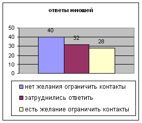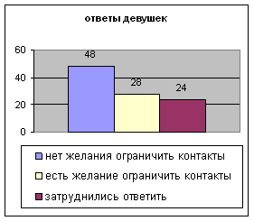 Рисунок 42. Желание респондентов ограничить какие-либо контакты с представителями других этнических групп. Большая часть респондентов не испытывает барьеров по отношению к представителям различных этнических групп в общении – 40% молодых людей и 48% девушек. Хотят ограничить контакты 28% респондентов обоих полов (рис.42).
