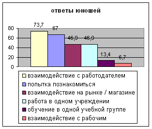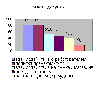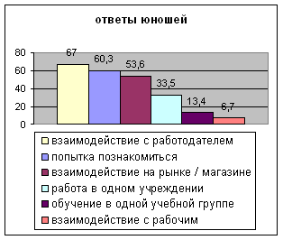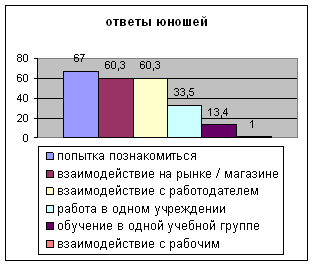 Рисунок 45. Виды контактов, которые респонденты хотели бы ограничить с представителями чеченской этнической группы. Самыми нежелательными контактами с представителями азербайджанской этнической группы являются попытка познакомиться – её отметили 67% юношей и 60,3% девушек, взаимодействие с работодателем – 60,3% юношей и 73,7% девушек, и взаимодействие на рынке/магазине60,5% молодых и 53,6% девушек. Не хотели бы работать в одном учреждении с азербайджанцем 33,5% респондентов мужского и женского пола. Взаимодействие с работодателем является самым нежелательным видом контактов с представителями армянской этнической группы, как у юношей, так и у девушек (по 67%). Хотят пресечь попытки знакомства, исходящие от армян, 60,3% респондентов обоих полов. 53,3% молодых людей и 33,5% девушек хотели бы ограничить взаимодействия с армянами на рынке/магазине. 40,2% и 33,5% девушек и юношей не хотят работать в одном учреждении с представителями армянской этнической группы. Взаимодействие с работодателем – представителем чеченской этнической группы хотели бы ограничить 73,7% молодых людей и 80,4% девушек. Попытка познакомиться, исходящая от чеченца является нежеланным контактом у 80,4% девушек и 67% юношей. Юноши также хотели бы сократить такие контакты с чеченцами, как работа в одном учреждении и взаимодействие на рынке/магазине (по 46,9%). Девушки больше не хотят что-то покупать у чеченцев (53,6%), чем вместе работать (40,2%). 46,9% девушек не хотели бы ездить в одном автобусе с представителями чеченской этнической группы (рис. 43, 44, 45). Изучив результаты вопросов поведенческого блока, мы пришли к такому выводу. В качестве партнера по общению респондентам более приятны армяне, однако большинство (72% и юношей, и девушек) для общения не выбрало бы никого из представителей интересующих нас этносов. Большинство респондентов обоих полов (около 35%) категорически не могут представить себе то, что связали бы свою жизнь браком с представителем (представительницей) какой-либо этнической группы. Треть респондентов хотела бы ограничить различные контакты с азербайджанцами, армянами или чеченцами. Этими контактами являются попытка познакомиться, взаимодействие с работодателем и взаимодействие на рынке/магазине.