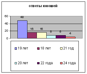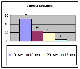 Рисунок 46. Возраст респондентов. По возрасту респонденты были распределены следующим образом. Большей части респондентов на момент проведения исследования было 19 лет (48% юношей и 52% девушек). По 18 лет и 21 году было 16% юношей. По 8% - 20 и 22 года. 24 года было 4% респондентов мужского пола. 24% девушек было 18 лет, 20% 20 лет. 17 лет было 4% девушек (рис. 46). Обобщив результаты, полученные после проведения анкеты, мы пришли к выводу, что на когнитивном уровне респонденты демонстрируют отсутствие знаний о культуре различных этнических групп – лишь малое количество респондентов смогла назвать традиции, обычаи, присущие различным этносам. И для юношей, и для девушек национальность играет важную роль, но не является решающей в общении с человеком, однако близких друзей другой национальности у них нет. Представители всех интересующих нас этнических групп, по мнению респондентов, проявляют хамство по отношению к женской части русского населения и в той или иной степени связаны с преступностью. На эмоциональном уровне к представителям различных этнических групп респонденты испытывают негатив, который проявляется в нежелании заводить знакомства, к негативному отношению к иммиграции в Новокузнецк вцелом. Больше всего недоброжелательности наблюдается по отношению к представителям чеченской этнической группы. От иммигрантов респонденты видят пользу в форме дешёвой рабочей силы. Негативными сторонами иммиграции являются преступность и распространение наркотиков. На поведенческом уровне респонденты демонстрируют желание соблюдать дистанцию с представителями различных этнических групп – треть респондентов бы хотела ограничить какие-либо контакты с ними. При возможности выбора, большинство респондентов не стало бы общаться с азербайджанцами, армянами и чеченцами. Также большая часть опрошенных не может представить себе брак с представителями различных этнических групп. Особых различий в ответах девушек и юношей не было обнаружено, таким образом можно утверждать, что гендерной специфики в восприятии этнических стереотипов не существует. Таким образом, заявленная в начале работы гипотеза о том, что студенты города Новокузнецка в отношении представителей различных этнических групп испытывают: на эмоциональном уровне – негатив, на поведенческом уровне – желание соблюдать дистанцию, на когнитивном уровне – отсутствие знаний о культуре; существует гендерная специфика в восприятии этнических стереотипов: девушки более доброжелательны, чем юноши подтверждена частично. ЗАКЛЮЧЕНИЕ Одним из основных источников стереотипов является конформность личности к групповым представлениям. Поэтому чаще всего не сам индивид создает свои стереотипы: он просто разделяет уже существующие в его социальной группе стереотипы. Это уже готовые определения и характеристики, даваемые различным расовым и этническим группам. Переходя в новый социальный мир, человек вынужден переадаптироваться и в этом процессе начинает усваивать новую систему стереотипов и убеждений. Они содержат в себе программы действий людей. После того как возникает дифференциация «мы — они» и формируются различные установки и мнения об этих группах, эти психические образования (стереотипы) начинают оказывать влияние на поведение людей. Зачастую поведение по отношению к членам др