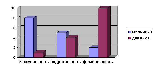 Диаграмма №1 - Результаты исследования по методике С. Бэм Проанализировав средние показатели по выборке обеих групп, можно сделать выводы о том, что подростки обоих полов оценивают себя со стороны гендера в соответствии со своей половой принадлежностью: для мальчиков свойственна маскулинность, для девочек – фемининность. Следующий метод – методика склонности к девиантному поведению. Тест позволил определить готовность подростков к реализации различных форм отклоняющегося поведения. Так по шкале «Установка на социальную желательность» получились следующие результаты: 7 юношей из 15 и 8 девушек в умеренной степени готовы давать социально-желательные ответы на вопросы испытания; 6 юношей и 7 девушек - демонстрируют строгое соблюдение даже малозначительных социальных норм, умышленном стремятся показать себя в лучшем свете, настороженно относятся к ситуации обследования. Только двое юношей из 15 не склонны скрывать собственные нормы и ценности, корректировать свои ответы в направлении социальной желательности. По шкале «Склонность к преодолению норм и правил» 9 юношей и 4 девушки предрасположены к преодолению каких-либо норм и правил, склонны к отрицанию общепринятых норм и ценностей, образцов поведения, противопоставлять собственные нормы и ценности групповым, способны «нарушать спокойствие», искать трудности, которые можно было бы преодолеть. У двоих подростков юношей чрезвычайно выражены нонконформистские тенденции, проявления негативизма. 11 девушек и лишь четверо юношей склонны следовать стереотипам и общепринятым нормам поведения. По третьей шкале – «Склонность к аддиктивному поведению» - видно, что 10 мальчиков и 12 девушек предрасположены к уходу от реальности посредством изменения своего психического состояния, склонны к иллюзорно-компенсаторному способу решения личностных проблем. Кроме того, их результаты свидетельствуют об ориентации на чувственную сторону жизни, о наличии «сенсорной жажды», о гедонистически ориентированных нормах и ценностях. Остальные испытуемые набрали менее 50 баллов, что говорит либо о не выраженности перечисленных качеств, либо о хорошем социальном контроле поведенческих реакций. 4 шкала – «Склонность к самоповреждающему и саморазрушающему поведению». По данной шкале были получены следующие результаты: 13 юношей и 6 девушек набрали от 50 до 70 баллов, что свидетельствует о низкой ценности собственной жизни, склонности к риску, выраженной потребности в острых ощущениях, о садо-мазохистских тенденциях. У остальных подростков, набравших менее 50 баллов, отсутствует готовность к реализации саморазрушающего поведения, тенденция к соматизации тревоги, склонности к реализации комплексов вины в поведенческих реакциях. По шкале «Склонность к агрессии и насилию» результаты свидетельствуют о наличии агрессивных тенденций у всех испытуемых юношей. И лишь один из них (набравший более 60 Т-баллов) агрессивно направлен во взаимоотношениях с другими людьми, склонен решать проблемы посредством насилия, использует унижение партнера по общению как средство стабилизации самооценки, имеются садистические тенденции. У девушек ситуация состоит чуть иначе: большинство из них (12 испытуемых) не агрессивны, не приемлют насилия как средства решения проблем, не принимают агрессию как способа выход