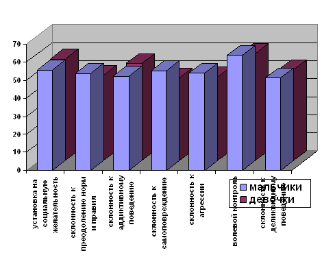 Анализ средних показателей обеих групп позволил сделать следующие выводы: юноши более склонны к преодолению норм и правил, самоповреждению, агрессии, деликвидному поведению, не способны к волевому контролю эмоциональных реакций, девушки – к установке на социальную желательность и аддиктивному поведению (диаграмма №2).