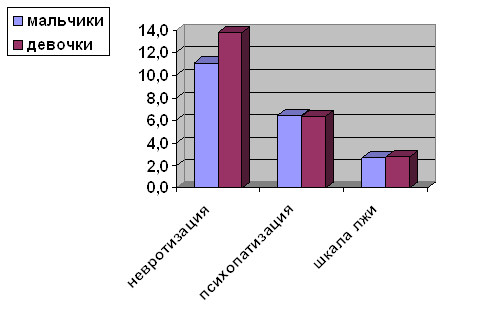 Анализируя средние показатели групп мальчиков и девочек (Диаграмма №), наблюдаем, что уровень невротизации девочек выше уровня невротизации мальчиков. Уровень психопатизации же находится в одинаковых состояниях. Шкала лжи показала, что выборка испытуемых обеих групп была максимально откровенна при проведении методики.