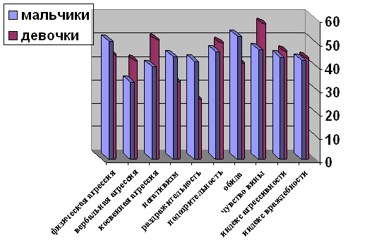 Диаграмма №5 - Результаты исследования по методике «Личностная агрессивность и конфликтность» Таким образом, исследования показали, что склонность к девиантному поведению подростков во многом определяются их гендерными особенностями. От гендерности подростка зависит его конфликтность, агрессивность, способность к самоповреждению, нарушению норм и правил.Выводы по второй главеПо проведенным исследованиям можно сделать следующие выводы:- склонность подростков к девиантному поведению зависит от гендерной принадлежности испытуемых; - подростки обоих полов оценивают себя со стороны гендера в соответствии со своей половой принадлежностью: для мальчиков свойственна маскулинность, для девочек – фемининность; - анализ склонности к девиантному поведению показал, что юноши более склонны к преодолению норм и правил, самоповреждению, агрессии, деликвидному поведению, не способны к волевому контролю эмоциональных реакций; девушки склонны к установке на социальную желательность и аддиктивному поведению; - уровень невротизации девочек выше уровня невротизации мальчиков. Уровень психопатизации для обеих групп испытуемых одинаковый. Шкала лжи показала, что выборка испытуемых обеих групп была максимально откровенна при проведении методик; - мальчики более склонны к физической агрессии, негативизму, раздражительности, обидчивости; девочки же, наоборот, к косвенной и вербальной агрессии, чувству вины. Расположенность к подозрительности в обеих группах испытуемых выражена в равной мере, у девочек чуть больше, чем у мальчиков. Индекс агрессивности и индекс враждебности для обеих групп испытуемых находится на одном уровне; - агрессия – как позитивная, так и негативная – свойственная мальчикам, данное качество у группы девочек не выражено. Такие же результаты наблюдаются и по общему показателю конфликтности: мальчики более склонны к конфликтам, нежели девочки. ЗаключениеОтклоняющимся поведением называют поведение, в котором устойчиво проявляются отклонения от социальных норм. При этом различают отклонения корыстного, агрессивного и социально-пассивного типа. Социальная ситуация развития подросткового возраста представляет собой переход от зависимого детства к самостоятельной и ответственной взрослости. Подросток занимает промежуточное положение между детством и взрослостью. Источник внутренних конфликтов и девиантного поведения заключается в различии между реальной и идеальной самооценкой, проявляющемся особенно ярко в старшем подростковом возрасте. Большое расхождение между Я- реальным и Я- идеальным считается тревожным симптомом, т.к. нередко ведет к нарушениям поведения и социально- психологической адаптации подростка. Многие проблемы, характерные для старшего подросткового возраста, объясняются увеличением расхождения между Я - реальным и Я - идеальным, а кроме того, выпадением одной из составляющих положительной Я - концепции. Положительная Я - концепция определяется 3 факторами: твердой убежденностью в импонировании другим людям, уверенности в способности к тому или иному виду деятельности и чувством собственной значимости, причем третья составляющая является скорее следствием первых двух. Иначе - появляются утверждения типа: "Меня не понимают", "Меня отвергают", "Меня не любят" и т.д. В рамках гендерног