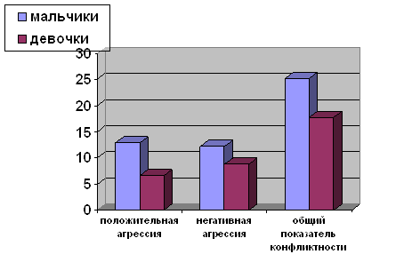 Анализ средних показателей показал, что агрессия – как позитивная, так и негативная – свойственная мальчикам, данное качество у группы девочек не выражено. Такие же результаты наблюдаются и по общему показателю конфликтности: мальчики более склонны к конфликтам, нежели девочки (диаграмма №5)