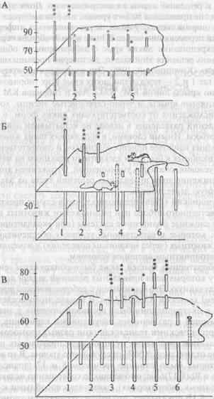 Рис. 1. Успешность решения теста на экстраполяцию животными разных генетических групп (пояснения в тексте). А — решение теста лисицами; Б — крысами; В — мышами. Высота столбца соответствует доле правильных решений задачи при первом (ближний ряд) и многократных (дальний ряд) предъявлениях задачи. Эксперименты с животными этих линий показали, что усиление способности к решению теста на экстраполяцию и другие особенности поведения, а также особенности обмена катехола-минов у этих мышей связаны именно с наличием в их кариотипе данной робертсоновской транслокации. Возможно, что причиной, лежащей в основе этих изменений в функции ЦНС при данной хромосомной перестройке, могут быть изменения в пространственном расположении генетического материала в интерфазном ядре, возникшие как следствие слияния хромосом. Данные по различиям способности к экстраполяции у животных, отличающихся друг от друга генетически, естественно, не стоят особняком, а являются частью огромной «базы данных», созданной к сегодняшнему дню учеными, работающими в области генетики поведения. Генетические исследования затрагивают практически все формы поведения, в том числе и способность к обучению, и способность к формированию пространственных предстаапений. Для того чтобы вкратце познакомиться с этим материалом, необходимо сначала дать краткий очерк основных методологических особенностей данного направления. Далее приводятся примеры использования генетических методов для изучения когнитивных способностей животных, а также краткое описание исследований генетических закономерностей психических способностей человека. 3. Методы и объекты генетики поведения. Генетические подходы к исследованию поведения позволяют выяснить, с чем именно связана изменчивость интересующего нас признака, т.е. в какой степени она связана с изменчивостью генотипов данной группы животных, а в какой — с внешними по отношению к генотипу событиями, воздействующими на ЦНС, а следовательно, и на поведение. В таких исследованиях важную роль играет использование так называемых генетических моделей — групп животных, состоящих из генетически «охарактеризованных», нередко идентичных (или почти идентичных) по генотипу особей с определенными физиологическими или биохимическими особенностями. Используют, например, линейных животных — инбредные и селектированные линии. Между инбредными линиями (мышей или крыс) обнаруживаются различия по тем или иным признакам поведения. Выявление таких межлинейных различий — обычно первый этап исследования. Следующим шагом в классических исследованиях по генетике поведения бывает скрещивание животных из линий, обнаруживших контрастные значения признака, с получением гибридов и анализом расщепления признаков во втором и последующем поколениях. Наряду с этим в генетике поведения используются селектированные линии, сформированные путем искусственного отбора на высокие и низкие значения какого-либо признака поведения (в таких случаях для скрещивания в последовательных поколениях отбираются животные соответственно с высокими и низкими значениями интересующего исследователя признака). После выведения таких линий нередко проводится их скрещивание и анализ проявления признаков у потомства. Данные такого классического генетического а