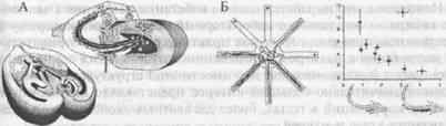 Рис. 2. Роль размера проекционной зоны iipMF гиппокампа мышей в формировании пространственного навыка поиска пищи в радиальном лабиринте. А — схема строения гиппокампа; толстой стрелкой показана зона окончания iipMF, Б — слева: схема последовательных посещений мышью лучей радиального лабиринта, содержащих приманку, с небольшим числом повторных, ошибочных заходов; справа: график, отражающий зависимость между числом ошибочных заходов на 5-й день теста у мышей ряда инбредных линий, различающихся (нижняя схема) по относительному размеру проекции iipMF, который отложен по оси абсцисс графика (по: Lipp, Wolfer, 1995). На большом и разнообразном экспериментальном материале было показано, что крысы и мыши тем лучше обучаются данному навыку, чем меньше у них площадь iipMF. Напомним, что выработка навыка избегания наказания в челночной камере — это типично лабораторный тест, аналога которому в естественном поведении грызунов практически нет. Его отрицательная корреляция с размером определенного отдела мозга еще ничего не говорит о функциональной значимости этой структуры. В этом отношении значительно больший интерес представляло исследование таких же корреляций в тестах, более адекватных экологической специализации крыс и мышей. Для выяснения участия генотипа в формировании когнитивных способностей животных более информативными оказались данные о корреляции размера iipMF с успешностью формирования навыка обучения в радиальном лабиринте (см. 3.4.2.1), которое требует формирования пространственных представлений (формирования «мысленного плана» лабиринта, см. 3.4). В таких экспериментах была обнаружена достоверная положительная корреляция размера iipMF и обучаемости мышей пространственному навыку (Schwegler, Lipp, 1995). На рис. 2Б слева показана схема перемещения мыши по радиальному лабиринту при решении задачи, а также график зависимости успешности выполнения навыка от размеров данной зоны синаптических окончаний. Под графиком схематически изображены размеры проекций мшистых волокон у мышей двух линий (см. выше). Выполнение теста Морриса (обучение в водном лабиринте, см. 3.4.2.2), точнее, «прочность» сформированной пространственной памяти, положительно коррелирует с размером iipMF (Schwegler, Lipp, 1995). Тесты на способность к обучению на основе формирования представления о пространстве и о своем положении в нем животные усваивают тем успешнее, чем больше у них размер проекциимшистых волокон гранулярных клеток на базальных дендритах пирамидных нейронов поля CA3 гиппокампа. Были проанализированы корреляции успешности выполнения «пространственных» и непространственных тестов с размерами и других областей гиппокампа (не только с iipMF), однако таких фенотипических корреляций с толщиной отдельных слоев гиппокампа в его разных участках, т.е. с числом клеточных элементов и мощностью дендритных стволов пирамидных клеток, не обнаружено (Schwegler, Lipp, 1995). Итак, обнаруженные нейроморфологические и поведенческие корреляции дают основание утверждать, что данная область синаптических окончаний (соединяющая гиппокамп с областью энторинальной коры и с новой корой) играет принципиально важную, ключевую роль в осуществлении и/или модуляции процессов обучения разных типов. Эти результаты были получены благодаря широкому использованию в лабораторных тестах генетически охаракте