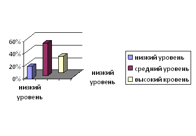 Таким образом, как видно из таблицы на этапе эксперимента были выделены следующие уровни развития произвольно-контекстной формы общения старших дошкольников: Низкий уровень развития произвольно-контекстной формы общения наблюдается у 20 % старших дошкольников; Средний уровень развития произвольно-контекстной формы общения наблюдается у 53 % старших дошкольников; Высокий уровень развития произвольно-контекстной формы общения наблюдается у 27 %старших дошкольников. Наглядно данные оценки по методике «Да и нет не говорите» представлены на рис. 1.