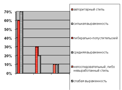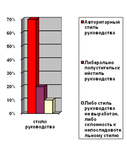 На основе проведённого исследования прослеживается зависимость. Авторитарный стиль управления преобладает у тех опрошенных, у которых наиболее выражены лидерские качества. Эту зависимость можно отразить в столбчатой диаграмме.