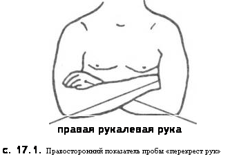 Большая работа по выявлению надежности различных двигательных проб с целью определения «рукости» проделана А. А. Саидовым (1982). На 1320 субъектах в возрасте от 6 до 16 лет автор изучил латеральные предпочтения по 12 пробам: 1) метание в цель, 2) письмо, 3) рисование, 4) резание ножницами, 5) забивание гвоздя молотком, 6) вдевание нитки в иголку (рука, держащая нитку), 7) чистка зубов щеткой, 8) зажигание спички, 9) раздача картинок (раздающая рука), 10) стрельба из игрушечного пистолета, 11) подметание щеткой (рука, находящаяся сверху), 12) вис на одной руке на перекладине. По пробам 1-5, 7, 8, 10 предпочтение правой руки выявилось в 93-98 % уже в 6-летнем возрасте, по остальным пробам предпочтение правой руки было несколько меньшим — в 67-76 % случаев. До сих пор, в качестве проб определения предпочтения руки, используются такие, как скрещивание рук перед грудью (рис. 17.1), наложение пальцев друг на друга («проба большого пальца»), потирание рук, аплодирование (В. А. Москвин, 1988; Е. И. Николаева, Н. М. Субботина, 1989; Е. Д. Хомская и др., 1999). Однако, как показано в многочисленных исследованиях зарубежных и отечественных авторов, обследовавших сотни и даже тысячи человек (Дж. Довней, 1926; Р. Хефнер, 1930; Е. В. Гурова, 1962 и др.), сверху большой палец правой руки у правшей бывает только в 43-63 % случаев, а левой руки — в 37-50 % случаев. По данным этих же авторов в среднем для 350 левшей левый палец был сверху в 52 % случаев, а правый — в 48 % случаев. Ясно, что по этой пробе ставить диагноз о право- или леворукости нельзя. Показана непригодность для этой цели и другой пробы — скрещивания рук на груди (поза Наполеона). По одним данным, полученным на 200 лицах, правая рука была сверху в 27 % случаев, левая — в 53 %, по другим данным, сверху чаще была правая рука (в 50 % против 32 % случаев, когда сверху была левая рука). Из последних работ, в которых проверялась эта проба, следует отметить исследование Н. Сакано (1982), показавшего на большом контингенте японцев и немцев, что правый и левый показатель пробы «перекрест рук» распределяются примерно равномерно. При аплодировании, по данным Е. В. Гуровой (1962), А. П. Чуприкова (1975) и других, найден высокий процент положения ведущей руки сверху у правшей и левшей (от 90 % до 100 % случаев). Установлена большая активность правой руки во время жестикуляции, начиная уже с 3-5-летнего возраста. Предложен также тест на завод часов, однако вряд ли он может считаться информативным, так как все часы изготавливаются таким образом, что заводить их удобнее правой рукой. Ряд авторов считают специфичным для леворукости наличие зеркального письма. Однако в действительности оно встречается довольно редко: от 8 до 33 % случаев (А. А. Капустин, 1924; Дж. Аюриягерра и др. П. Ajuriaguerra et al, 1956). ВЫЯВЛЕНИЕ ПРАВО-ЛЕВОРУКОСТИ ПО РАЗВИТИЮ НА ОБЕИХ РУКАХ ДВИГАТЕЛЬНЫХ КАЧЕСТВ Уже в конце XIX — начале XX века многие авторы указывали на необходимость выявлять право- и леворукость по измерению двигательных качеств. Особенно они подчеркивали значение измерения мышечной силы обеих рук, полагая, что несмотря на воспитание этот показатель изменяется мало. Действительно, как было показано выше, асимметрия по силе рук стабильно проявляется во всех возрастных группах. Теми же достоинствами обладает и другой психомоторный показатель — максимальная частота движений, которая у правшей больше на правой руке, а у левшей — на левой. Одна