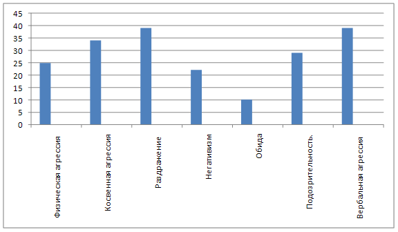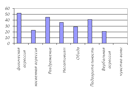 Рисунок 3 - Процентное соотношение симптомокомлексов по методике ДДЧ Самый высокий процент симптомокомплексов в данной группе школьников – чувство неполноценности, незащищенности. Показатели агрессивности у школьников из детского дома Во-первых, ребёнок из детского дома, уже на первый взгляд не вписывается в атмосферу группы своей наивностью, несамостоятельностью, непосредственностью, он часто конфликтует со сверстниками, не воспринимает и не выполняет школьных требований, но в то же время он прекрасно чувствует себя в игре, прибегая к ней в тех случаях, когда возникает необходимость уйти от трудной для него учебной деятельности, хотя высшие формы игры со строгими правилами детям недоступны и вызывают страх и отказ играть. Дети этой группы игнорируют нормы и правила поведения (как в игре, так и вне игры), ведут себя очень шумно, демонстративно обижаются, кричат, однако их эмоции носят поверхностный характер и быстро переходят в более спокойные состояния. Эти данные позволяют предположить, что в данном случае мы имеем дело с некоторым отставанием в общем психическом развитии ребенка. Среди испытуемых есть дети, которые используют агрессию в основном как норму поведения в общении со сверстниками. По результатам проведенной методики, я могу сказать, что уровень агрессивности в данной группе достаточно высокий, следовательно, дети проявляют враждебность, агрессивность, озлобленность по отношению к сверстникам. Это говорит о том, что у большинства детей существует серьёзные трудности в установлении контактов со сверстниками и взрослыми. Результаты проведенной методики Басса Дарки, показывают, что уровень агрессивности и враждебности у юношей достаточно высокий: Таблица 3 - Показатели агрессивности
