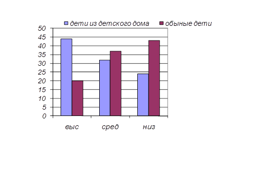 Рисунок 7 - Процентное соотношение общего уровня агрессивности Мы видим, что существуют различия в уровнях агрессивности. А именно, у детей из детского дома, агрессивность выражена больше, чем у обычных школьников. Т.е учащиеся из детских домов, отличаются склонностью к соперничеству, напористостью, желанием превзойти других, раздражительностью, неадекватным самоконтролем. Об этом можно судить и по ответам самих детей, при проведении обследования, я заметила, что ответы детей из детского дома, качественно отличаются от ответов обычных школьников, а именно: ответы неконкретные, неточные, с употреблением нецензурных выражений, агрессивностью по отношению к экспериментатору. При обработке полученных данных с помощью методов математической статистики я выявила, что данные агрессивности различаются на достоверном уровне.