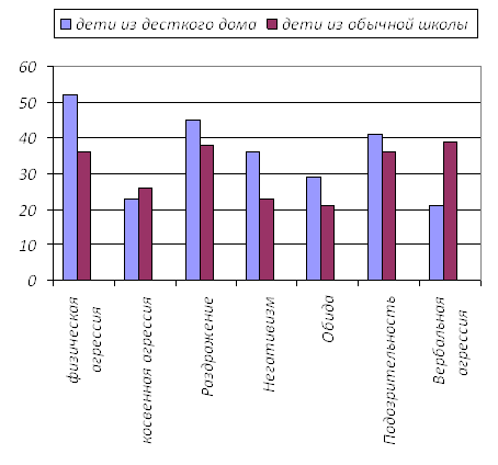 Рисунок 8 - Показатели агрессивности Выявлены достоверные различия по следующим шкалам: физическая агрессия (у ребят из детских домов выше), косвенная агрессия на 5% уровне (выше у обычных школьников), по параметру раздражение - различий нет. Негативизм и обида – на 5% уровне (выше у ребят из детских домов, в обоих случаях); подозрительность - различий не выявлено. Вербальная агрессия на процентном уровне, выше у обычных школьников. У школьников из детских домов, большое количество реакций, направленных против воли взрослого, частое отсутствие правильного понимания социальной роли и положения, на ярко выраженные трудности в различении важнейших черт межличностных отношений. Указанные особенности детей создают дополнительные трудности для диагностической и коррекционной работы с ними.
