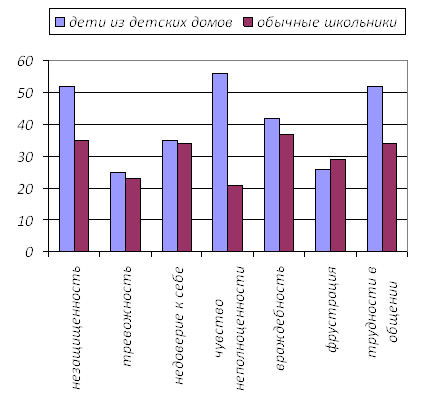 Рисунок 9 - Показатели по методике ДДЧ Нужно отметить, что ещё у детей из детского дома, снижена потребность в общении как со сверстниками, так и с взрослыми. У большинства из детей обнаруживается повышенная тревожность по отношению к взрослым, от которых они зависят. Дети почти не стремятся получить от взрослых оценку своих качеств в развёрнутой форме, обычно их удовлетворяет оценка в виде недифференцированных определений («хороший мальчик», «молодец»), а так же непосредственное эмоциональное одобрение (улыбка, поглаживание и т. д.). Необходимо отметить, что хотя дети по собственной инициативе крайне редко обращаются за одобрением, но в большинстве своём они очень чувствительны к ласке, сочувствию, доброжелательному отношению. У детей данной категории наблюдаются снижение потребности в общении со сверстниками, а так же низкая эффективность их общения друг с другом во всех видах деятельности. Так, изучение симптомокомплексов позволило констатировать, что дети из детского дома проявляют более высокие уровни аффективно-личностных нарушений по сравнению со школьниками из обычных школ. У детей из детского дома, в отличие от сверстников из семей, агрессия, представляет собой угрозы и запугивание (ребенок показывает кулак товарищу или пугает его); реальная агрессия - это уже непосредственное физическое нападение (у детей драки принимают формы укусов, царапанья, хватания за волосы, применения в качестве “оружия” палок, кубиков и пр.). Наиболее часто у подавляющего большинства детей из детского дома, наблюдается косвенная и прямая вербальная агрессия - от жалоб и агрессивных фантазий (“Позову бандитов, они тебя побьют и завяжут”) до прямых оскорблений (“Толстуха”, “Дурак”, “Ябеда и нытик”). У некоторых проявляется физическая агрессия, как в косвенной форме, так и в прямой. Среди ситуаций, провоцирующих агрессивность, как у детей из детского дома, так и у их сверстников, выделили: желание привлечь к себе внимание сверстников; ущемление достоинства другого с тем, чтобы подчеркнуть свое превосходство; стремление защититься и отомстить; стремление получить желанный предмет. Как можно понять, большинство негативных явлений, у детей из обычной семьи, наблюдается в ситуации защиты своих интересов, отстаивания своего превосходства. Действия эти используются как средство достижения определенной цели. В то же время, у детей из детского дома, агрессивные действия вообще не имеют какой-либо цели, и направлены исключительно на причинение вреда другому. У этих детей удовлетворение вызывает физическая боль, унижение сверстника, и агрессия при этом выступает как самоцель. О чем свидетельствует такое поведение? О склонности ребенка к враждебности и жестокости, что, естественно, вызывает особую тревогу. Анализ поведения агрессивного ребёнка позволяет прогнозировать дальнейшую с ним работу и ожидаемые результаты. Все меры должны быть направлены на преодоление внутренней изоляции, на формирование в ребенке способности видеть и понимать других, воспитание доброжелательного отношения к сверстнику. Задачу эту можно решить, отказавшись от некоторых привычных форм, присущих учреждениям пребывания детей сирот. 2.4 Выводы по третьей главеДля достижения поставленной цели и подтверждения выдвинутой гипотезы мной была разработана программа 