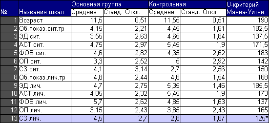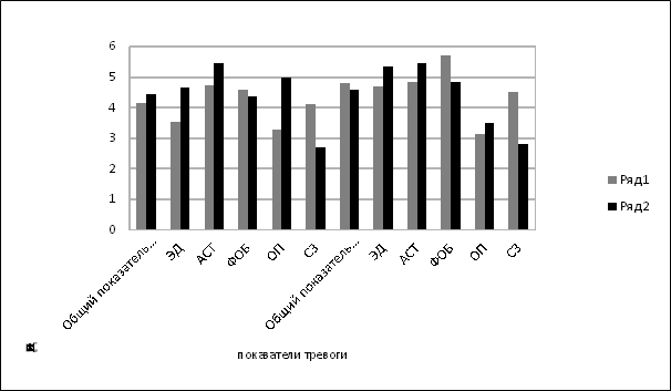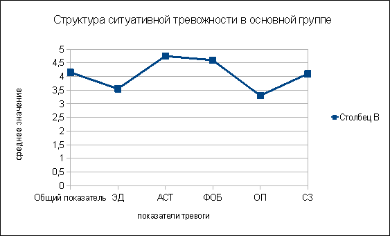 Результаты, полученные в ходе исследования, показали, что среднее значение общего показателя ситуативной тревожности в основной группе относится к нормальному уровню. При этом в структуре тревоги наиболее выражен Астенический компонент тревожности.