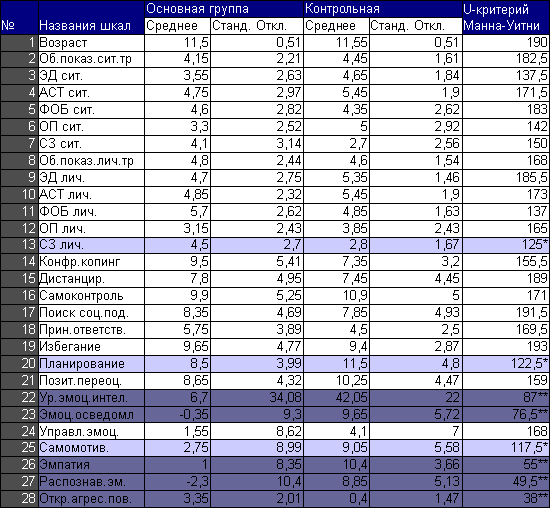 Комментарии: на данном графике представлены результаты по методике Кдиагностика Эмоционального Интеллекта (Н.Холл), в основной группе. По горизонтали мы видим – название оси «шкалы», по вертикали – «среднее значение». Это означает, что на данном графике отображены результаты по каждому показателю методики, численно представлены средние значения в основной группе. Синим цветом обозначена основная группа. По результатам методики «Тест руки» в основной группе обнаруживается агрессивность. 3.2Сравнение результатов, полученных в основной и контрольной группахПодсчет полученных данных по методике Интегративный Тест Тревожности показал, что в основной и контрольной группах ситуативная и личностная тревожность относятся к нормальному уровню. Таблица 3.2.