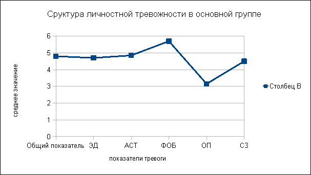 Рисунок 3.1.Структура ситуативной тревожности в основной группе. Комментарии: на данном графике представлены результаты по методике ИТТ-С(Интегративный Тест Тревожности — Ситуативная), в основной группе. По горизонтали мы видим – название оси «показатели тревоги», по вертикали – «среднее значение». Это означает, что на данном графике отображены результаты по каждому показателю ситуативной тревожности, численно представлены средние значения в основной группе. Синим цветом обозначена основная группа. Среднее значение общего показателя личностной тревожности в основной группе относится к нормальному уровню. При этом в структуре личностной тревожности выражен Фобический компонент.