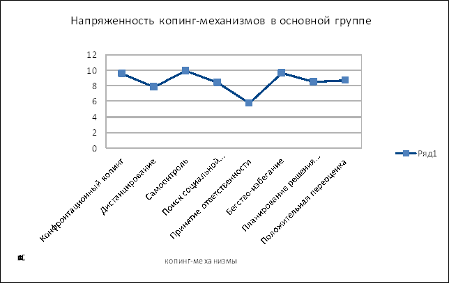 Комментарии: на данном графике представлены результаты по методике ИТТ-Л(Интегративный Тест Тревожности — Личностная), в основной группе. По горизонтали мы видим – название оси «показатели тревоги», по вертикали – «среднее значение». Это означает, что на данном графике отображены результаты по каждому показателю ситуативной тревожности, численно представлены средние значения в основной группе. Синим цветом обозначена основная группа. В основной группе низки уровень напряженности копинг-мханизма Принятие ответственности. Напряженность таких копинг-механизмов как Конфронтационный копинг, Дистанцирование, Самоконтроль, Поиск социальной поддержки, Бегство-избегание, Планирование решения проблемы, Положительная переоценка относятся к среднему уровню