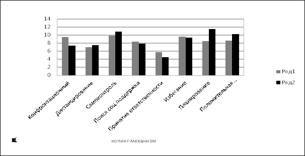 Комментарии: на данном графике представлены средние значения по методике ИТТ(Интегративный Тест Тревожности ), в основной и контрольной группах. По горизонтали мы видим – название оси «показатели тревоги», по вертикали – «среднее значение». Это означает, что на данном графике отображены результаты по каждому показателю ситуативной и личностной тревожности, численно представлены средние значения в основной и контрольной группах. Серым цветом обозначена основная группа, черным — контрольная. По результатам методики Копинг-тест Лазаруса можно сказать, что в основной и контрольной группах низкий уровень напряженности копинга Планирование. В основной и контрольной группах средний уровень напряженности копинг-механизмов Конфронтационный, Дистанцирование, Самоконтроль, Поиск социальной поддержки, Принятие ответственности, Бегство-избегание, Положительная переоценка. В основной группе достоверно ниже напряженность копинга Планирование.