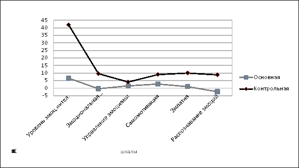 Комментарии: на данном графике представлены средние значения по методике Диагностика Эмоционального Интеллекта, в основной и контрольной группах. По горизонтали мы видим – название оси «шкалы», по вертикали – «среднее значение». Это означает, что на данном графике отображены результаты по каждому показателю методики, численно представлены средние значения в основной и контрольной группах. Серым цветом обозначена основная группа, черным — контрольная. Проведение методики Тест Руки показало, что в основной группе агрессивность достоверно выше (средние значения см. в Приложении 2).