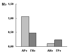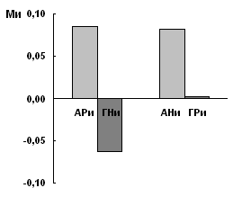 Рис 2.1. Направленность этнических стереотипов русских и немцев по данным эксплицитного метода Результаты показывают, что, по данным эксплицитного метода (рис.2.1), имеет место преобладание положительных черт во всех 4 этностереотипах. При этом для русской выборки характерно преобладание положительных черт в автостереотипе (самооценке), причем значение показателя М является наибольшим по абсолютной величине из всех и достоверно выше нуля (p<0,001), и так же достоверно превышает степень представленности положительных черт в образе «типичный немец» (p<0,05). Положительные черты существенно больше представлены и в самооценке русских (АРэ) по сравнению с самооценкой немцев (АНэ) ((p<0,001), и оценкой немцев образа «типичный русский» (p<0,001). Для немецкой выборки характерны более низкие абсолютные значения показателя преобладания в этностереотипах положительных качеств. Достоверно (p<0,001) преобладает выраженность этих черт в представлениях немцев о «типичном русском» (ГРэ), тогда как в оценке немцев самих себя (АНэ) нет преобладания положительных или отрицательных черт. Таким образом, можно утверждать, что эксплицитный метод показывает сдвиг этностереотипов в сторону преобладания в них положительных черт. Вместе с тем для русской выборки характерна более высокая степень представленности в авто- и гетеростереотипах положительных личностных свойств, тогда как немецкой выборке присуща более осторожная и близкая к нейтральной оценка. Иная картина открывается при переходе к результатам имплицитного метода (рис.2.2).